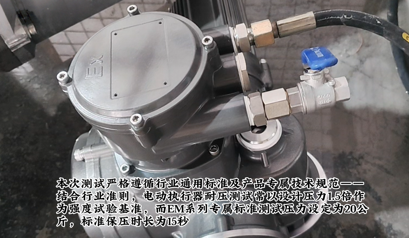 本次測試嚴格遵循行業通用標準及產品專屬技術規范。結合行業準則,電動執行器耐壓測試常以設計壓力 1.5 倍作為強度試驗基準,而 EM 系列專屬標準將測試壓力設定為 20 公斤,標準保壓時長為 15 秒,這一參數設置充分體現了揚州揚修對產品品質的嚴苛要求。